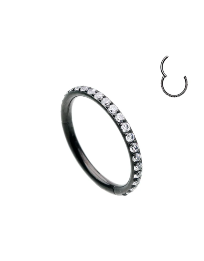316L Surgical steel hinged segment ring with clear side-facing cubic zirconia. These beautiful jewelled clickers look great in the nostril, daith, rook, snug, helix or tragus.